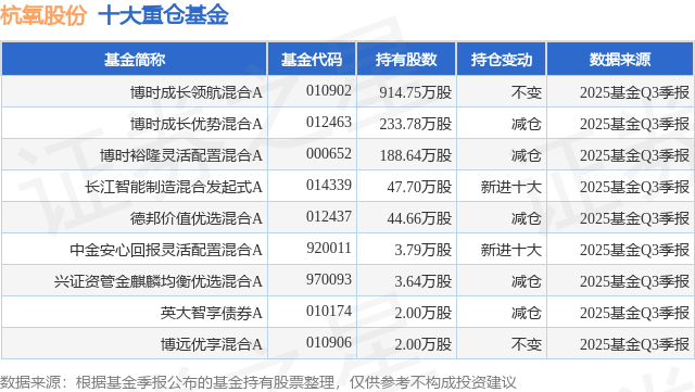 根据2025基金Q3季报公募基金重仓股数据,重仓该股的公募基金共9家,其中持有数量最多的公募基金为博时基金的博时成长领航混合A。博时成长领航混合A目前规模为33.93亿元,最新净值0.8189(11月19日),较上一交易日下跌0.32%,近一年上涨16.17%。该公募基金现任基金经理为陈鹏扬 郭康斌。陈鹏扬在任的基金产品包括:博时裕隆灵活配置混合A,管理时间为2015年8月24日至今,期间收益率为210.13%;博时成长优势混合A,管理时间为2021年8月3日至今,期间收益率为0.43%;博时成长臻选混合A,管理时间为2022年1月25日至今,期间收益率为35.76%。郭康斌在任的基金产品包括:博时价值臻选持有期混合A,管理时间为2022年2月23日至今,期间收益率为-10.7%;