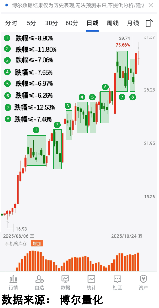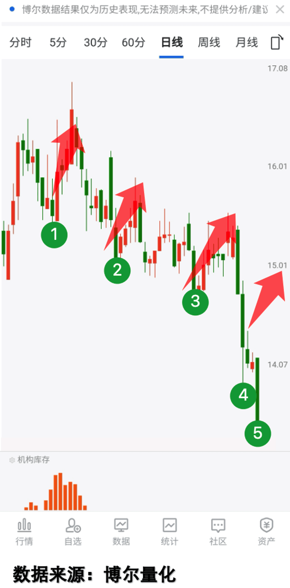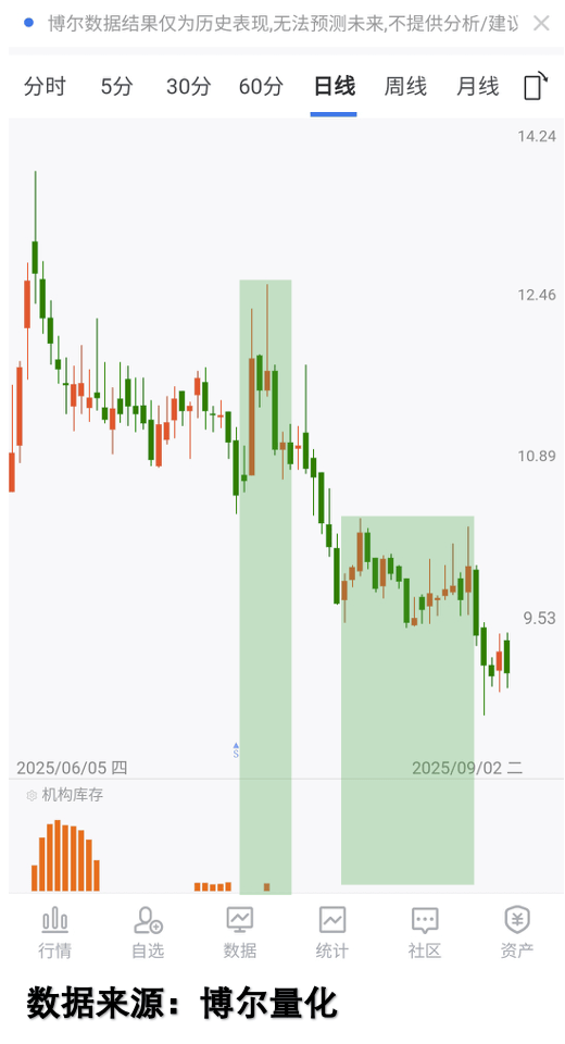 除了涨高就慌,大家另一个容易踩的坑就是“盲目抄底”:看着股价跌了一大截,觉得已经到低点了就冲进去,结果套在半山腰,甚至低点下面还有低点。其实所谓的“低点”,从来不是看股价跌了多少,而是看有没有真正的资金在“托底”。 比如有只科技股,在整体行情不错的时候反而一路下跌,每次跌到底就会小幅反弹一下,看起来像见底了,不少人忍不住冲进去,结果一买就套。但用量化大数据看“机构库存”就会发现,除了第一次反弹有短暂的橙色柱体,之后的所有反弹里,“机构库存”都消失了,说明机构大资金根本没参与这些反弹,就像一群散户在自娱自乐,这样的行情自然走不远。 看图3: