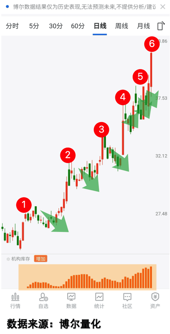 大家是不是都有过这种“追悔莫及”的经历:一只股票涨了不少,看着天天有调整,心里发慌忍不住卖了,结果卖完之后它接着蹭蹭涨,拍大腿都没用。其实不是你定力不够,是你没看到行情背后的真实情况。 比如有只股票,两个月里涨幅超过70%,远远跑赢了大盘,但仔细看走势会发现,48个交易日里有26天都是调整的,而且每次创出阶段新高就开始回调,换谁都会忍不住犯嘀咕:是不是要见顶了?但如果我们看“机构库存”指标,就会发现每次调整的时候,橙色的柱体一直都在,说明机构大资金根本没闲着,还在积极参与交易,这种调整只是正常的“中场休息”,不是行情结束的信号。 看图2: