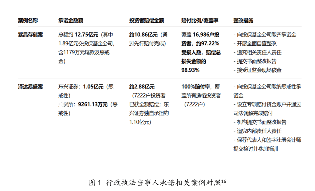 2023 年 12 月 29 日,中国证监会查处广东紫晶信息存储技术股份有限公司欺诈发行、信息披露违法违规案件,涉及的中介机构包括中信建投证券、两家事务所及某律师事务所。¹³上述机构因涉嫌未勤勉尽责而被立案调查。根据《证券法》第一百七十一条及《证券期货行政执法当事人承诺制度实施办法》,证监会允许当事人提出承诺申请,经审查符合条件的,可以通过承诺机制化解案件风险。在此框架下,4 家中介机构分别与证监会签署了承诺认可协议。具体措施如下,首先在承诺金缴纳方面,4 家中介机构共计缴纳约 12.75 亿元承诺金。其次在签署协议前,机构已通过先行赔付方式向 16,986 户投资者支付约 10.86 亿元,覆盖率高达 97.22%。再次,对于剩余约 1.89 亿元承诺金,由中国证券投资者保护基金公司统一管理,用于尚未支付的损失款(1179万元)及惩戒性资金。最后由各机构需提交自查整改报告,追究责任人责任,证监会对整改情况进行现场核查。在 2024年 8 月 30 日,证监会认定上述机构已履行承诺协议要求,依法终止对其调查。这是执法承诺制度首次在资本市场大案中得到大规模应用。